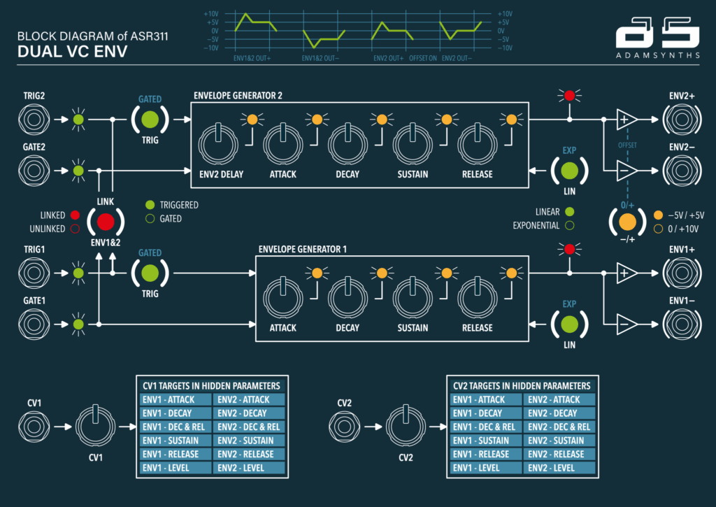 Attack, Decay, and Release times are adjustable between 2 ms and 10 s, while the Sustain level ranges from 0 to 10 V.